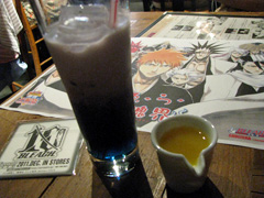 ちなみに、マユリ様の「実験ドリンク」なるものを注文しました。そのままだと子供のシロップ風邪薬のような味がするんだけど、黄色い液体を入れるとオレンジジュースになります。色はドブ色(爆)・・・・・じゃなくて、不気味な紫ですが!