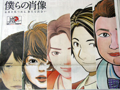 嵐ファンの皆さまなら当然手に入れてるでしょうが、今日の朝日新聞の朝刊!5人の漫画家の先生方が描きおろした嵐の面々ーーー!素敵でしたなぁvv「鉄コン筋クリート」の松本大洋がニノを、「ハチクロ」の羽海野チカが翔くんを、「花より男子」の神尾葉子が松潤を、「バーテンダー」の長友健篩が相葉さんを、「怪物くん」の藤子不二雄(A)が大ちゃんを。