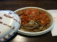 一見ナポリタンのようですが、麺は焼きうどんと焼きそばの中間のような感じで、独特のトマトソースがかかってます。白生姜が添えられていて、全体のバランスが絶妙なのですよ!美味しいのー!!!ウチの旦那も大のお気に入りで、こっちに来ると必ず食べて帰りますvv大きなスーパーなどに行くとたいてい売ってるので、機会があったら是非ご賞味あれ☆