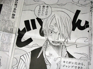 今週のジャンプは、表紙にも巻頭カラーにもサンちゃんがあああああ~かわゆい~vv今回の尾田っちの巻頭カラーは、いつもと雰囲気が違って素敵ですねvv「え、サンちゃんがゾロに笑いかけてる!?」なんて一瞬心が躍ったら、違った・・・・・二人の間にブルックがいた。(笑)