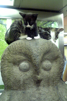 その様子があんまり可愛かったんで思わず写メを撮ってしまったんだけど、冷静に考えるとこの猫は一体?もしかして誰かが置いて行った捨て猫?そしたらカワイソー!なんて思いつつ家に帰ってネットで検索したら、いけふくろうに乗る迷い猫は時々目撃される光景みたいですね。(しかも同じ猫っぽい)それなら安心だvvつーか、そんなに居心地良いのかそこ!(笑)子猫、かわゆかったですvv