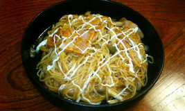 ここのナポリ焼きそばがすごく美味しくて、いつも食べますvv要はナポリタン風の焼きそばなんですが、鉄板にこびり付いた焦げ部分がうまあい♪これなら作れそうだと思って、以前自分でチャレンジしてみたんですけど、ん~・・・・・何かが違いました。(苦笑)