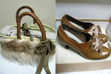 お次は小物。シーズンのはじめは小物を揃えて気分を出すジャガーです。小ぶりのファー付きカゴバッグと7センチヒールの靴!上のワンピースとトータルで合わせて着用してまーす。